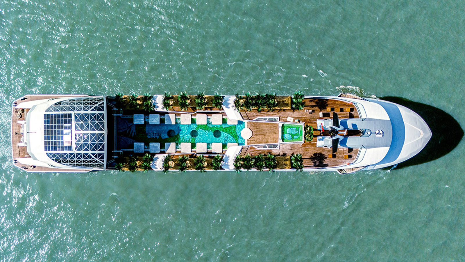 Bể bơi trên du thuyền: Bể bơi nước mặn bốn mùa ở tầng 2 có diện tích 268m2, dài 33m, rộng 8,3m; sâu 1,4m, công trình không chỉ đơn thuần là một bể bơi mà còn là trái tim của không gian giải trí ngoài trời, nơi du khách vừa thư giãn vừa hòa mình vào khung cảnh di sản hùng vĩ.