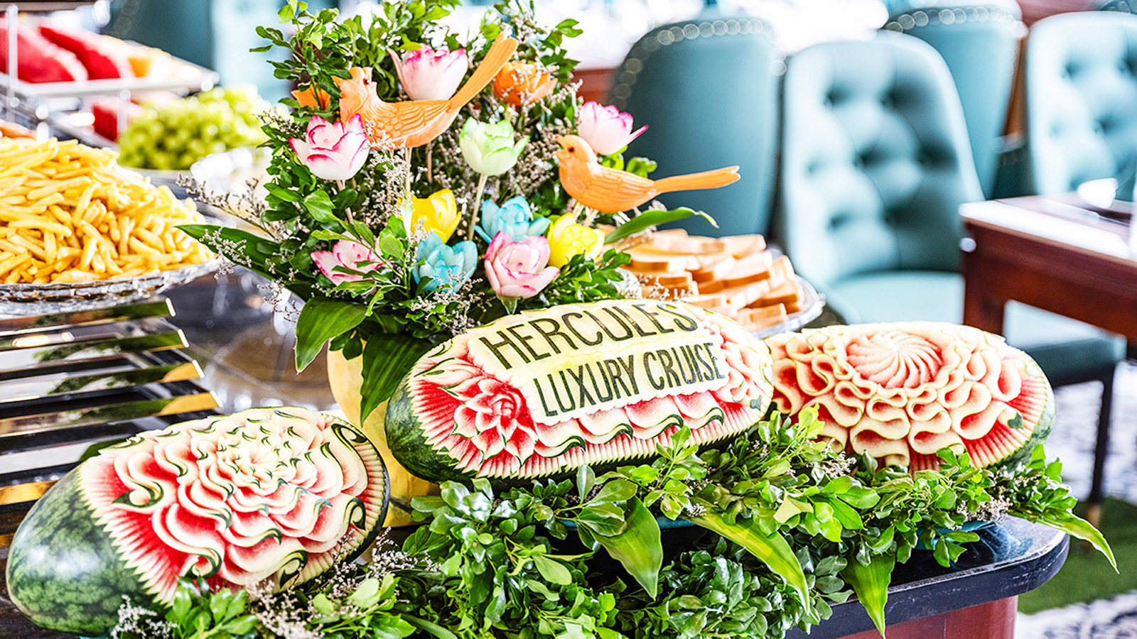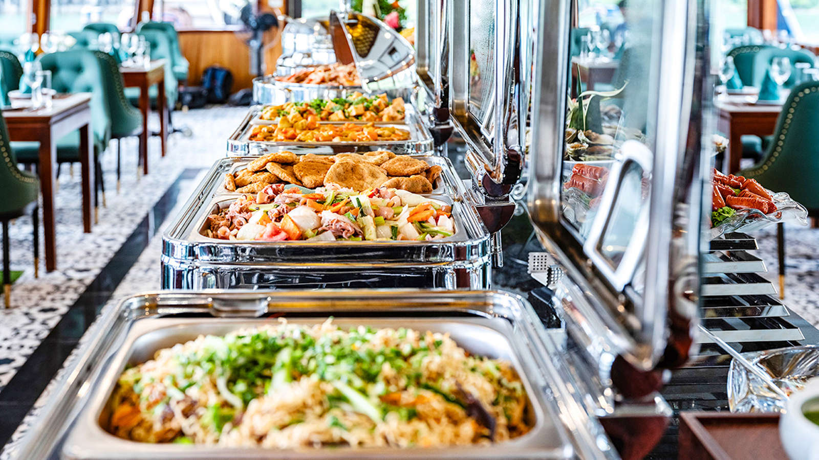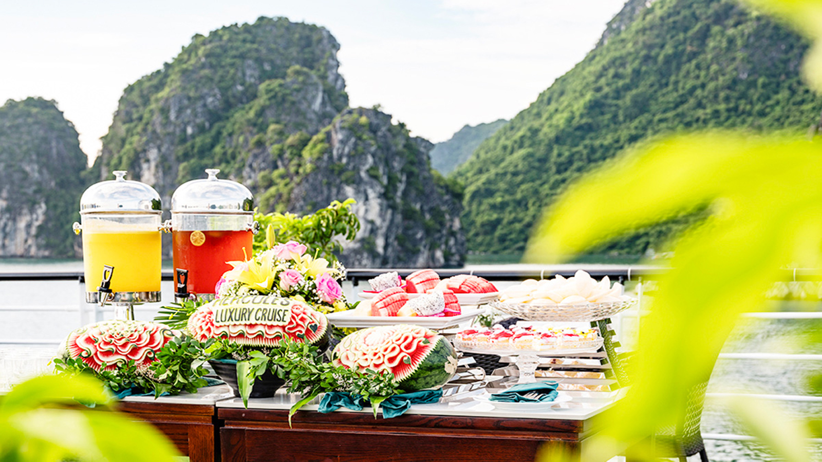 12:15 - 13:15: Sau khi du thuyền xuất bến Quý khách sẽ thưởng thức bữa trưa Buffet tại nhà hàng sang trọng trên du thuyền. Du thuyền Hercules Hạ Long sẽ đưa Quý khách tham quan một số điểm nổi tiếng trên Vịnh Hạ Long, như Hòn Chó Đá, Hòn Đỉnh Hương, Hòn Trống Mái… Quý khách có thể chụp ảnh lưu giữ những khoảnh khắc tuyệt đẹp trên Vịnh Hạ Long.