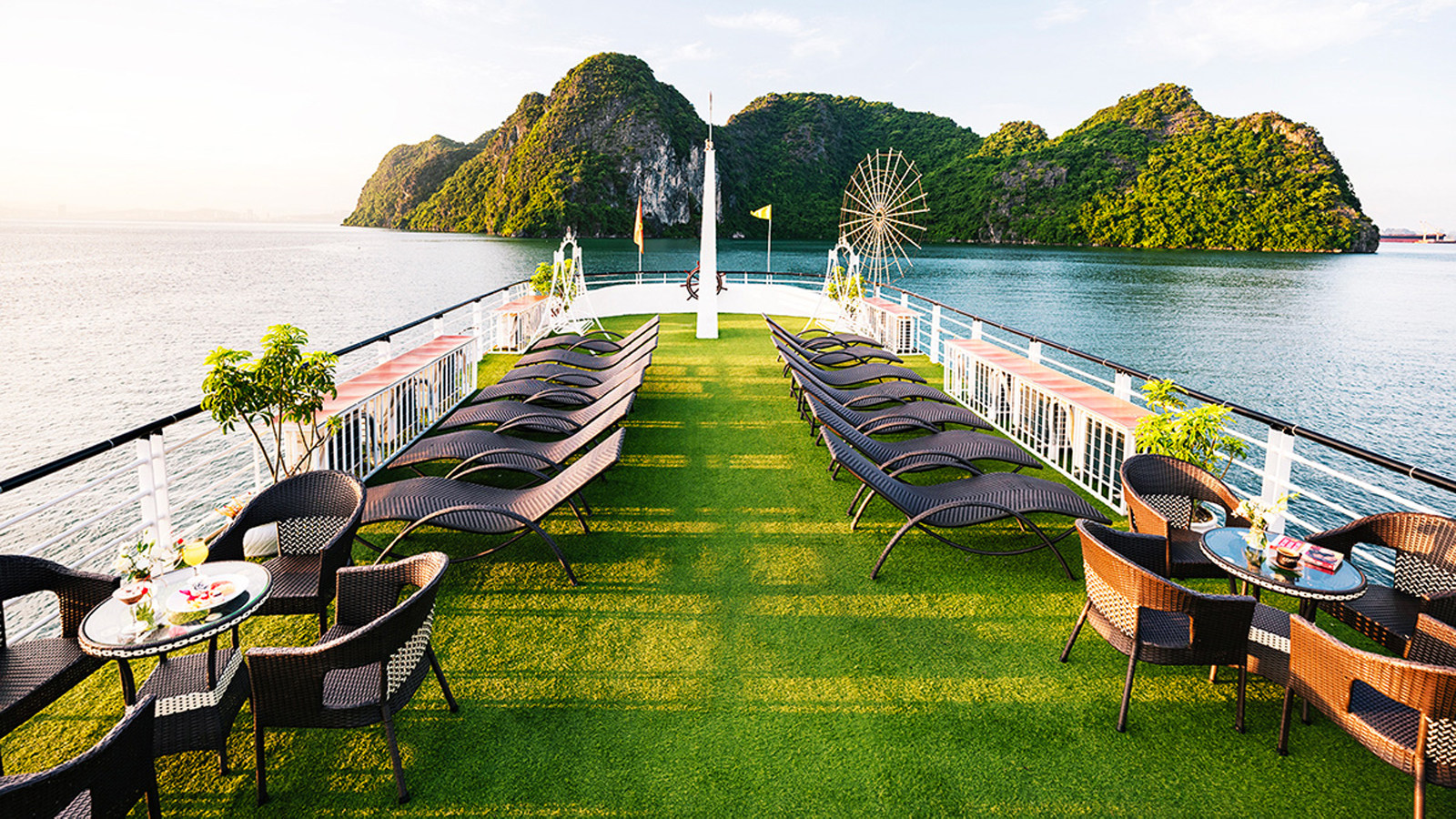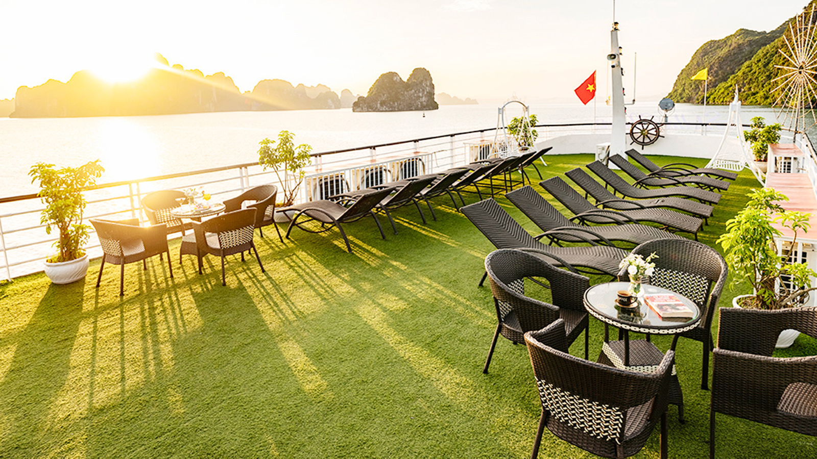 Tầng 3 Sundeck nằm ở phía trên cùng của Du thuyền Hercules Luxury Hạ Long là nơi lý tưởng nhất để du khách có thể ngắm cảnh, tắm nắng và đặt biệt là ngắm hoàng hôn lãng mạn trên Vịnh Hạ Long.