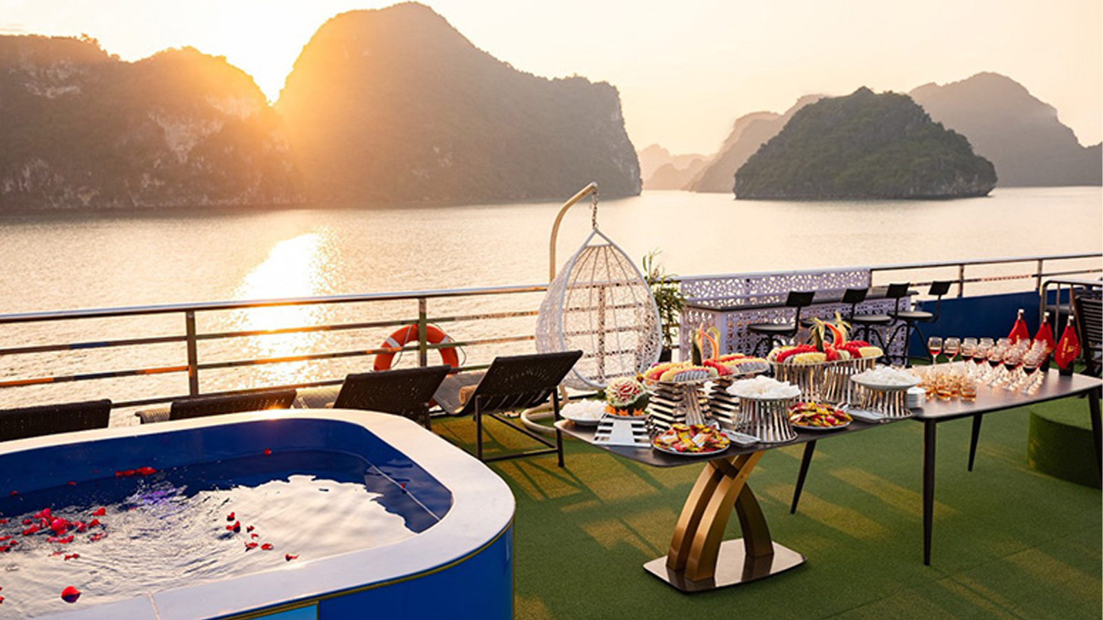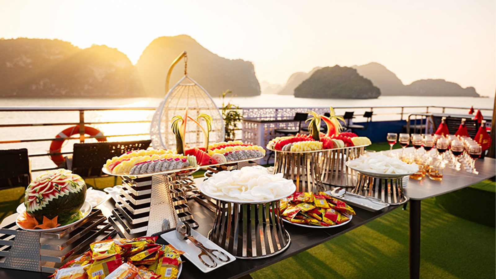 16:30 - 18:00: Quý khách quay lại Du thuyền Jewels of the Bay để trở về bến, Quý khách sẽ được phục vụ trà chiều dưới ánh hoàng hôn, gồm các đồ ăn nhẹ như bánh ngọt, trái cây,…