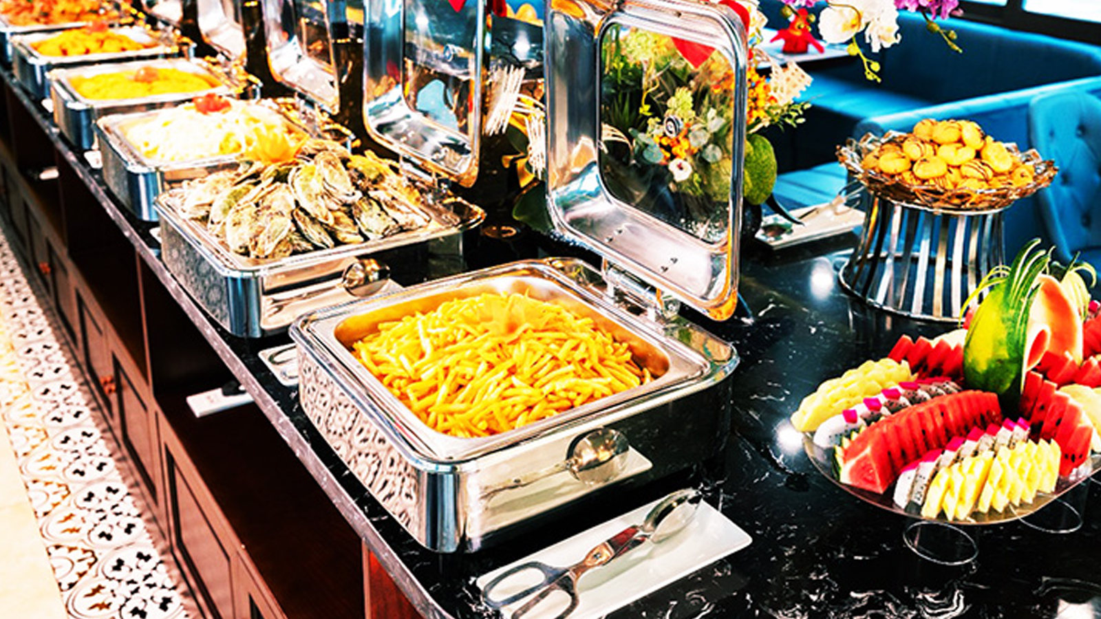 12:15 - 13:15: Quý khách sẽ thưởng thức bữa trưa Buffet tại nhà hàng sang trọng trên du thuyền. Du thuyền Jewels of the Bay sẽ đưa Quý khách đi ngang qua khu vực có Hòn Con vịt, Hòn Ngón tay - Một đảo đá vôi tuyệt đẹp nhô lên từ mặt biển.