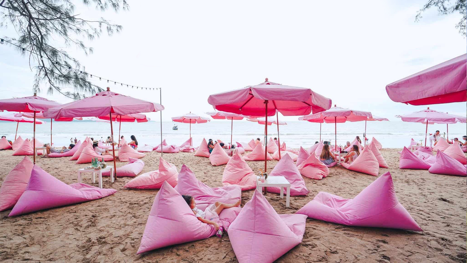 Đặc trưng của quán là phong cách trang trí màu hồng pastel nổi bật – từ ghế bean-bag, gối nằm sát bãi biển cho tới các góc chụp hình đẹp mắt. (Công ty DL tặng mỗi quý khách Voucher 100Bth để mua đồ uống)